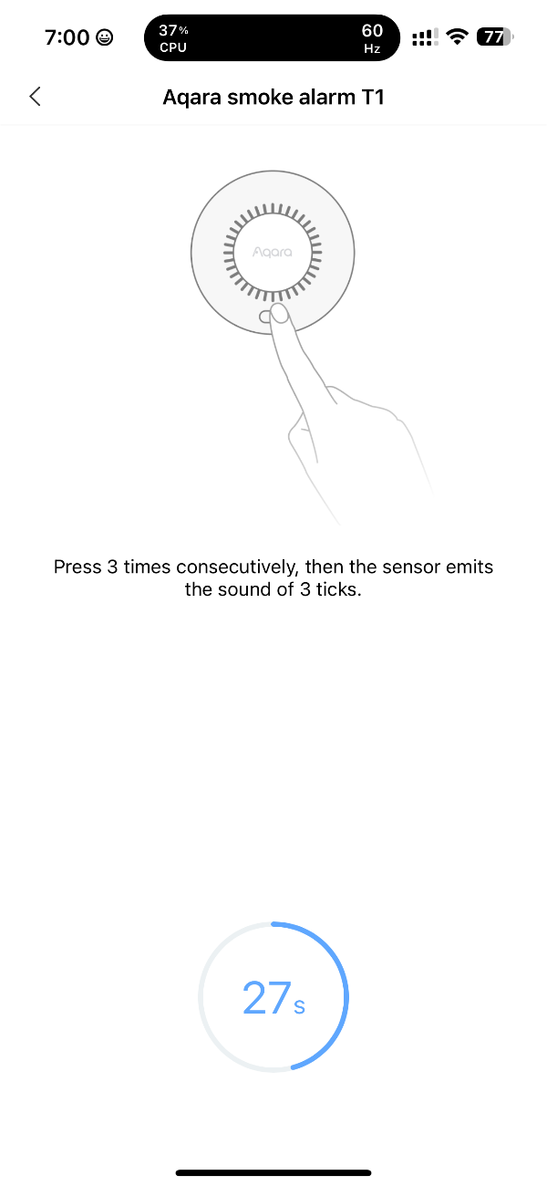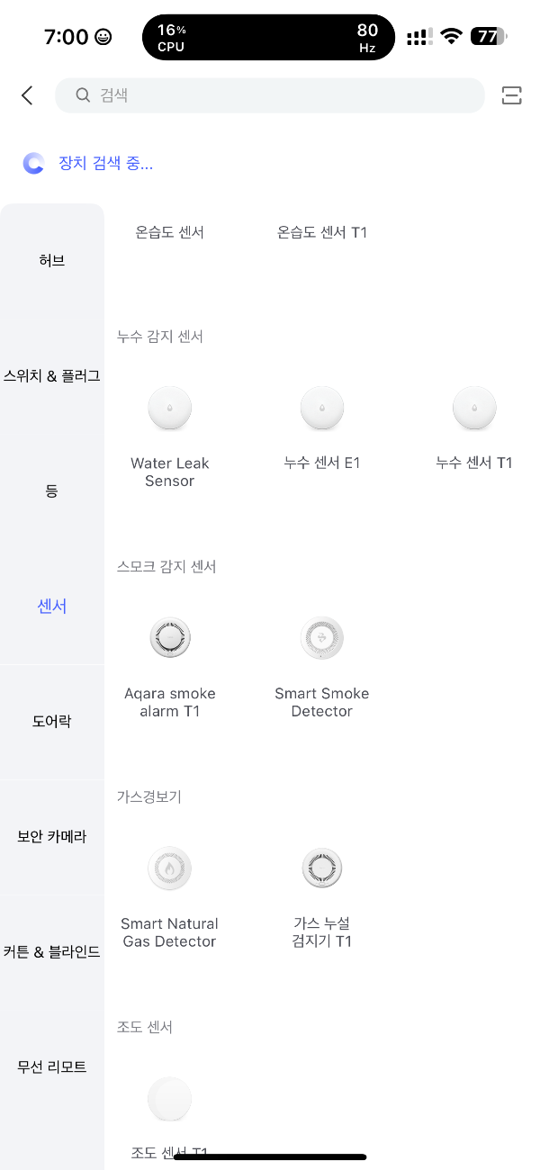 앱 실행 - 장치 - 장치추가 - 센서 Smart Smoke Detector 선택 - 허브선택 - 버튼 3번 클릭 - 페어링 완료
