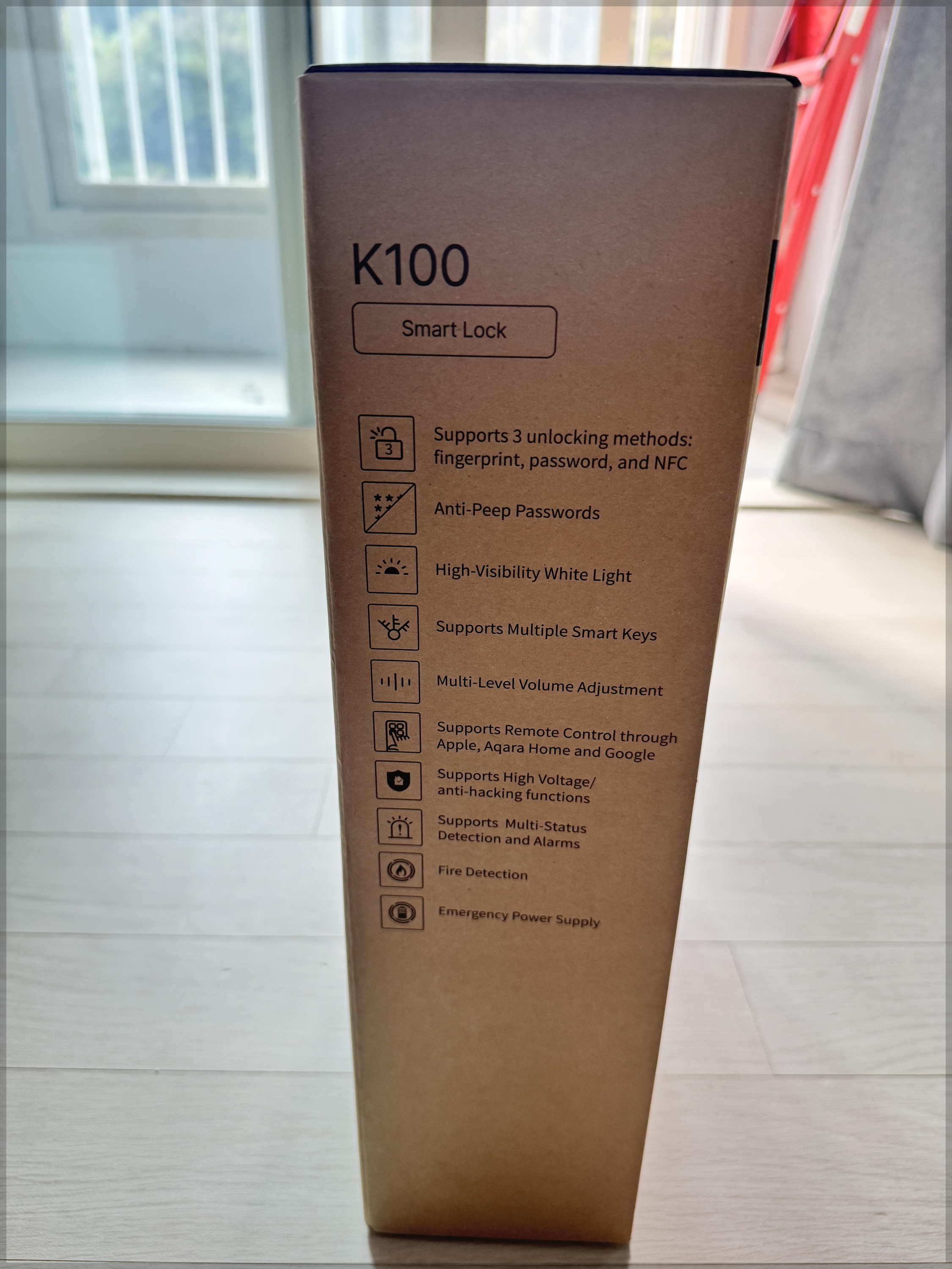 박스 왼편에는 스마트 도어락 K100의 기능들을 설명해두었습니다.