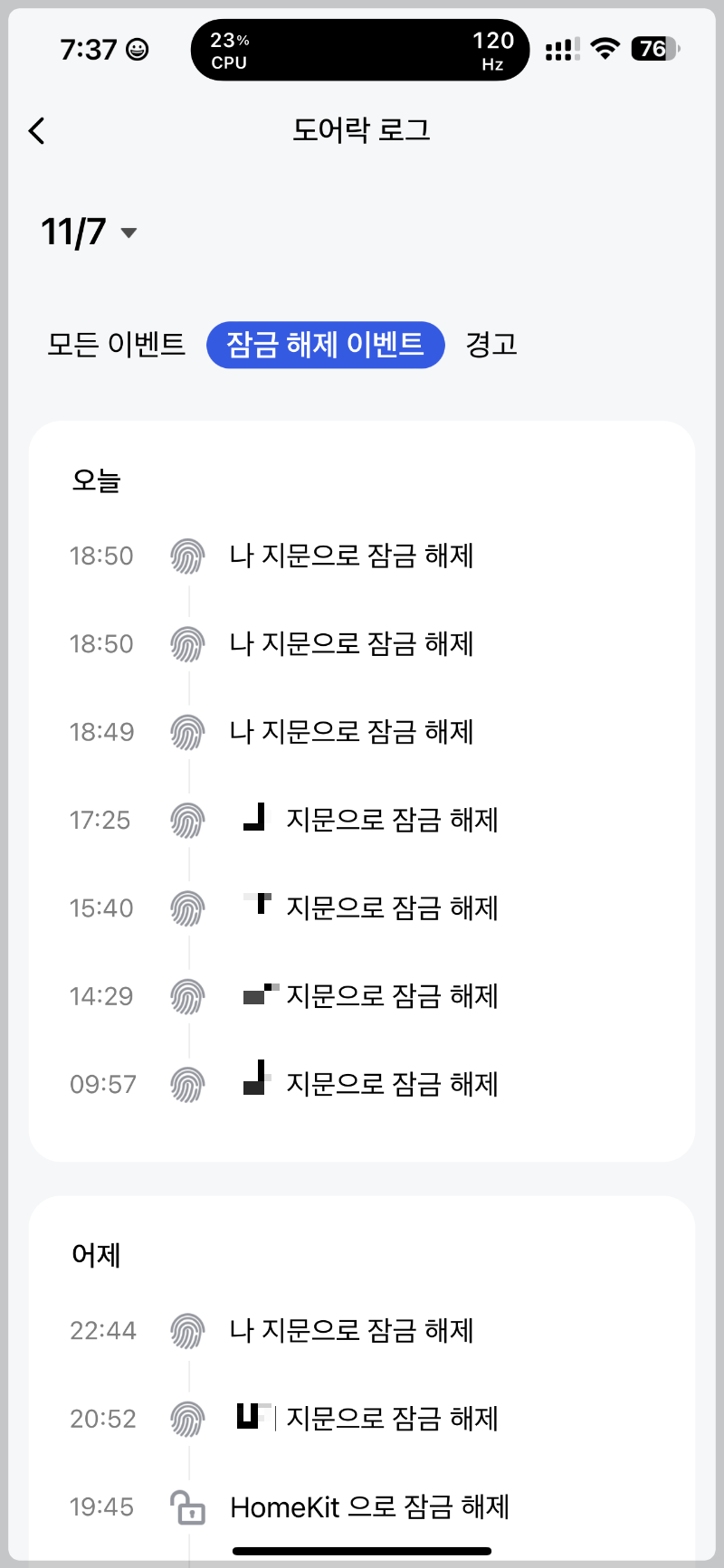 이벤트란에 들어가면 도어락이 열리고 닫힘시간, 어떤걸로 잠금이 해제되었는 확인이 가능합니다.