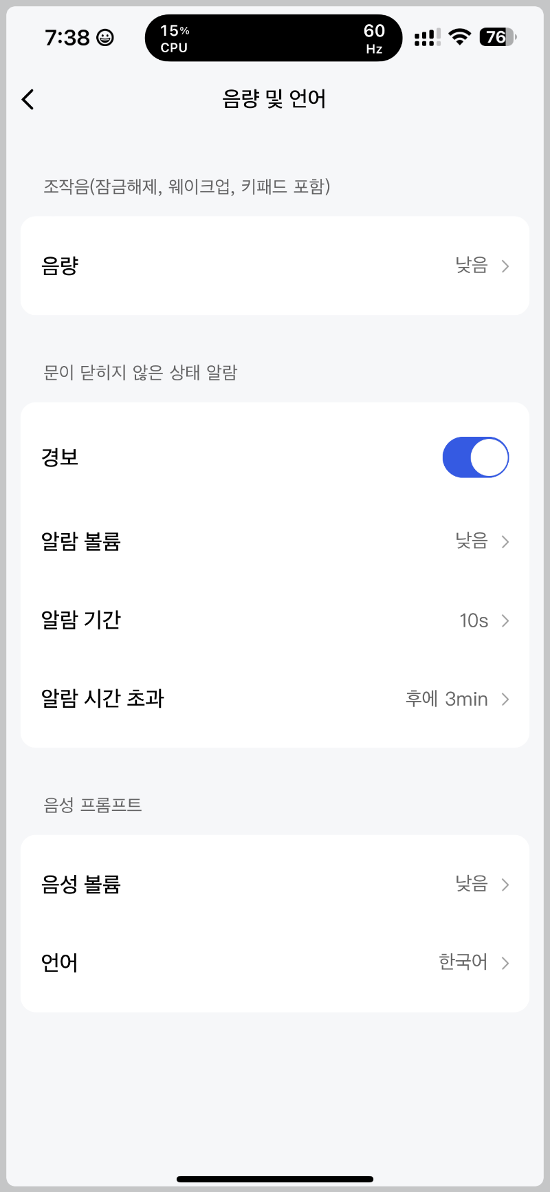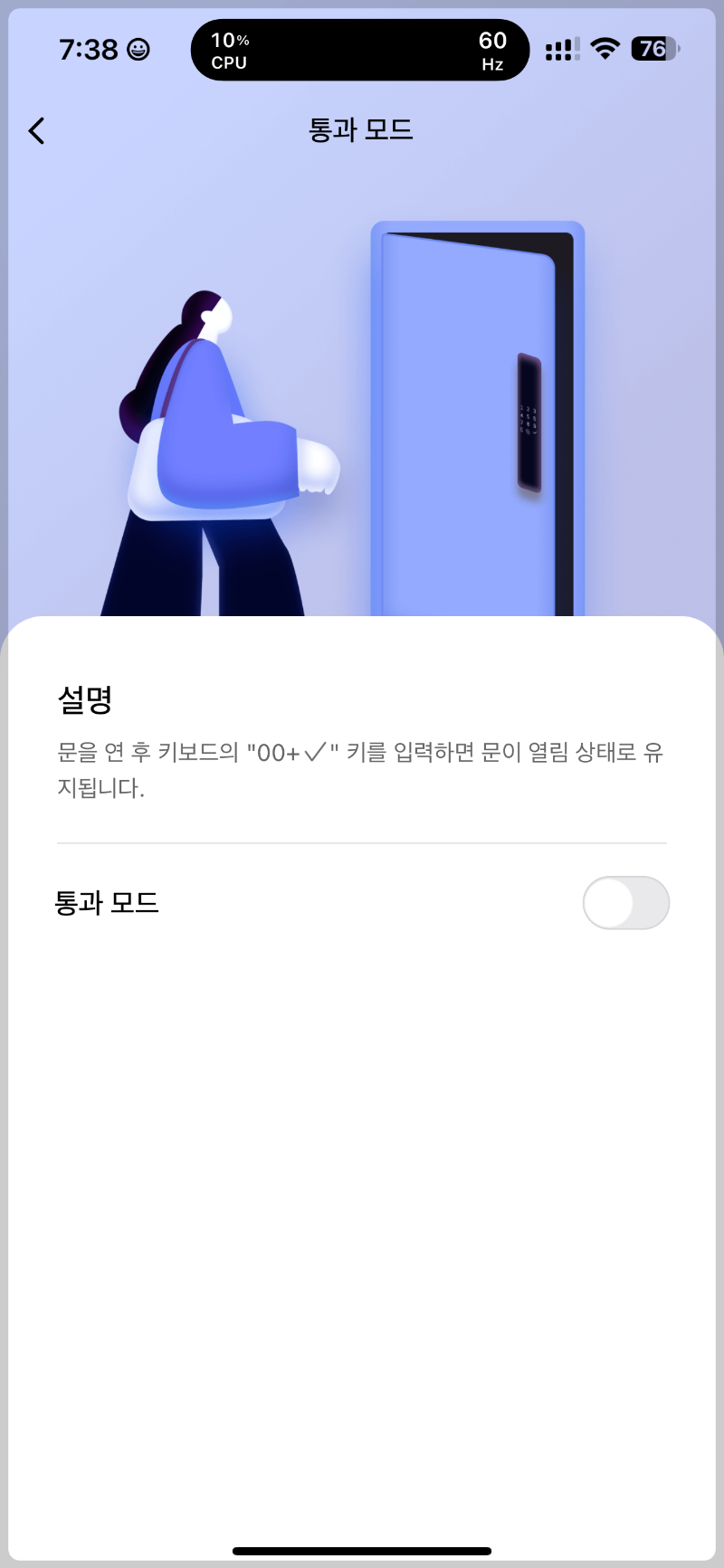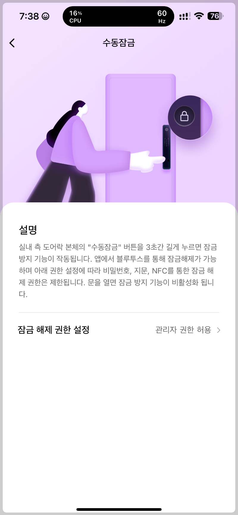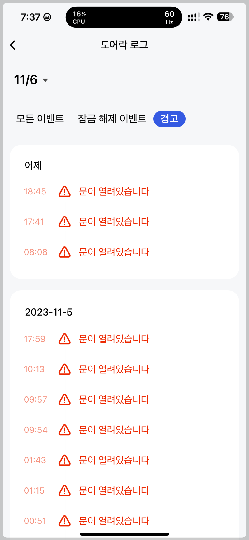 문이 어느정도 열여있으면 도어락에서 경보가 울리고 알림을 받게 되어있습니다.