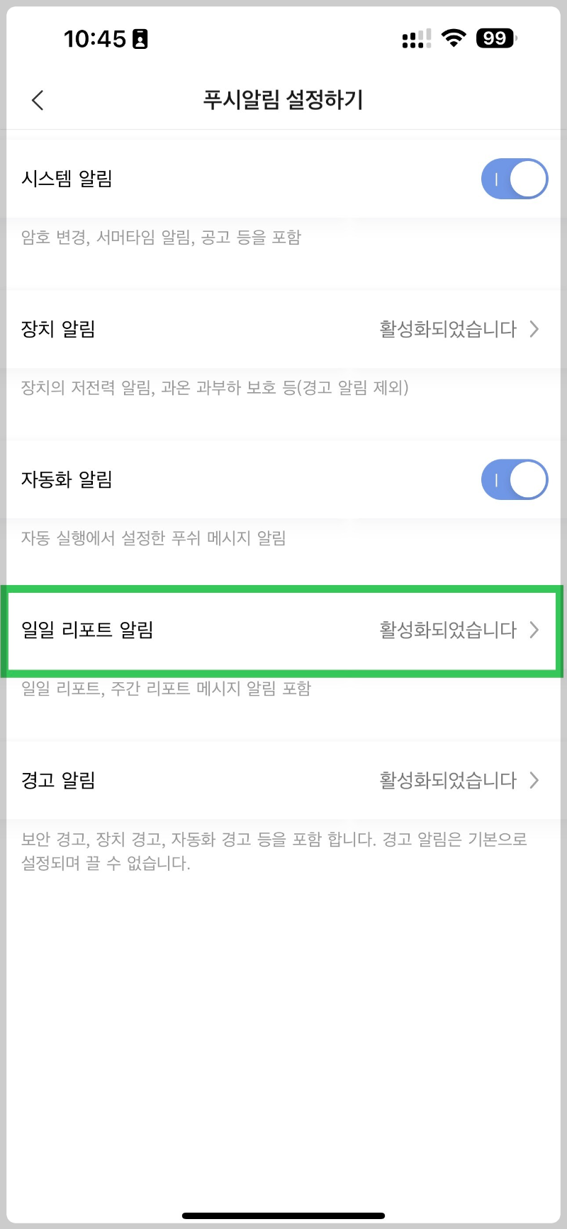 일일 리포트 알림 들어가서 내가 만든 홈을 선택,알림선택