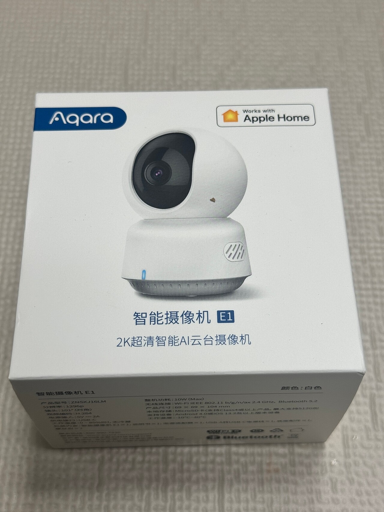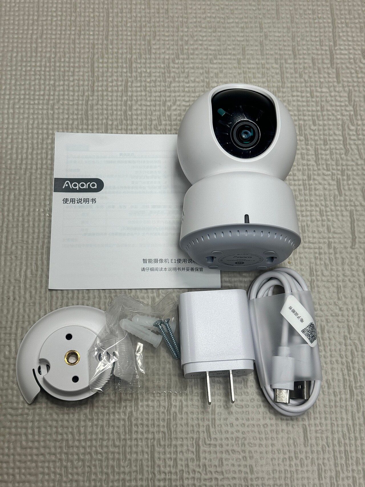 구성품은 E1 카메라, 아답터, 케이블, 나사, 거치대, 설명서